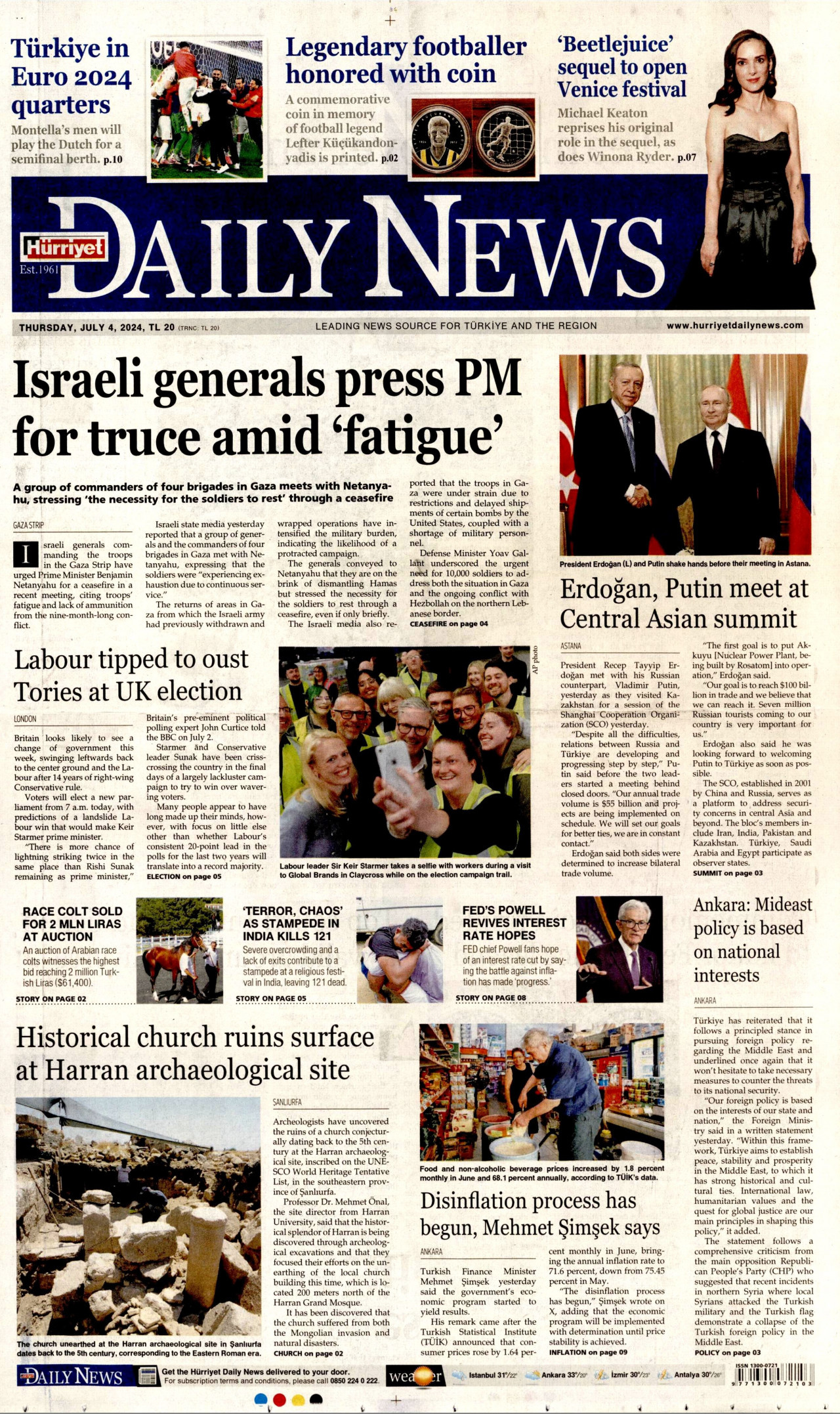 HÜRRİYET DAİLY NEWS Gazetesi 04 Temmuz 2024, Perşembe Günü Manşeti