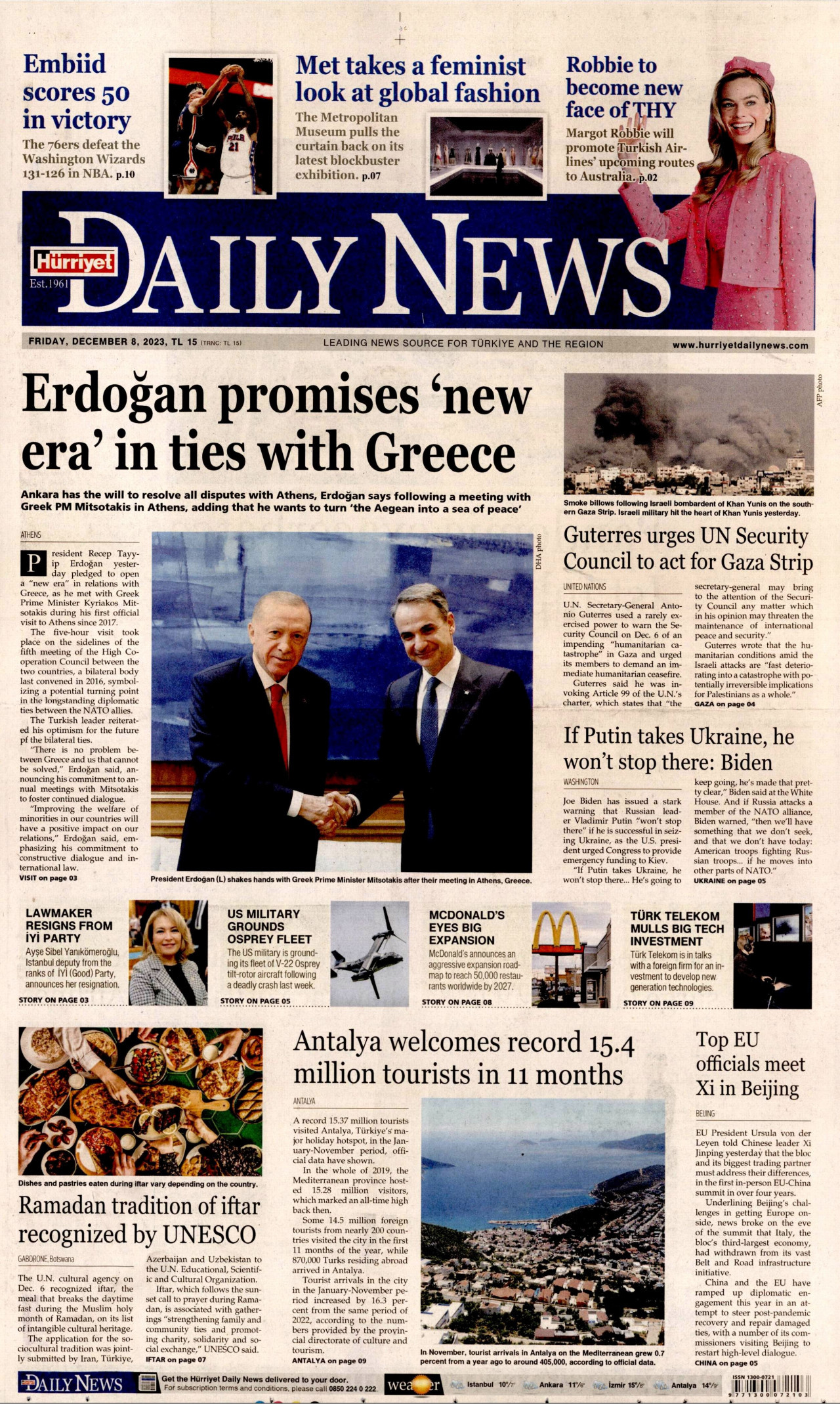HÜRRİYET DAİLY NEWS Gazetesi 08 Aralık 2023, Cuma Günü Manşeti