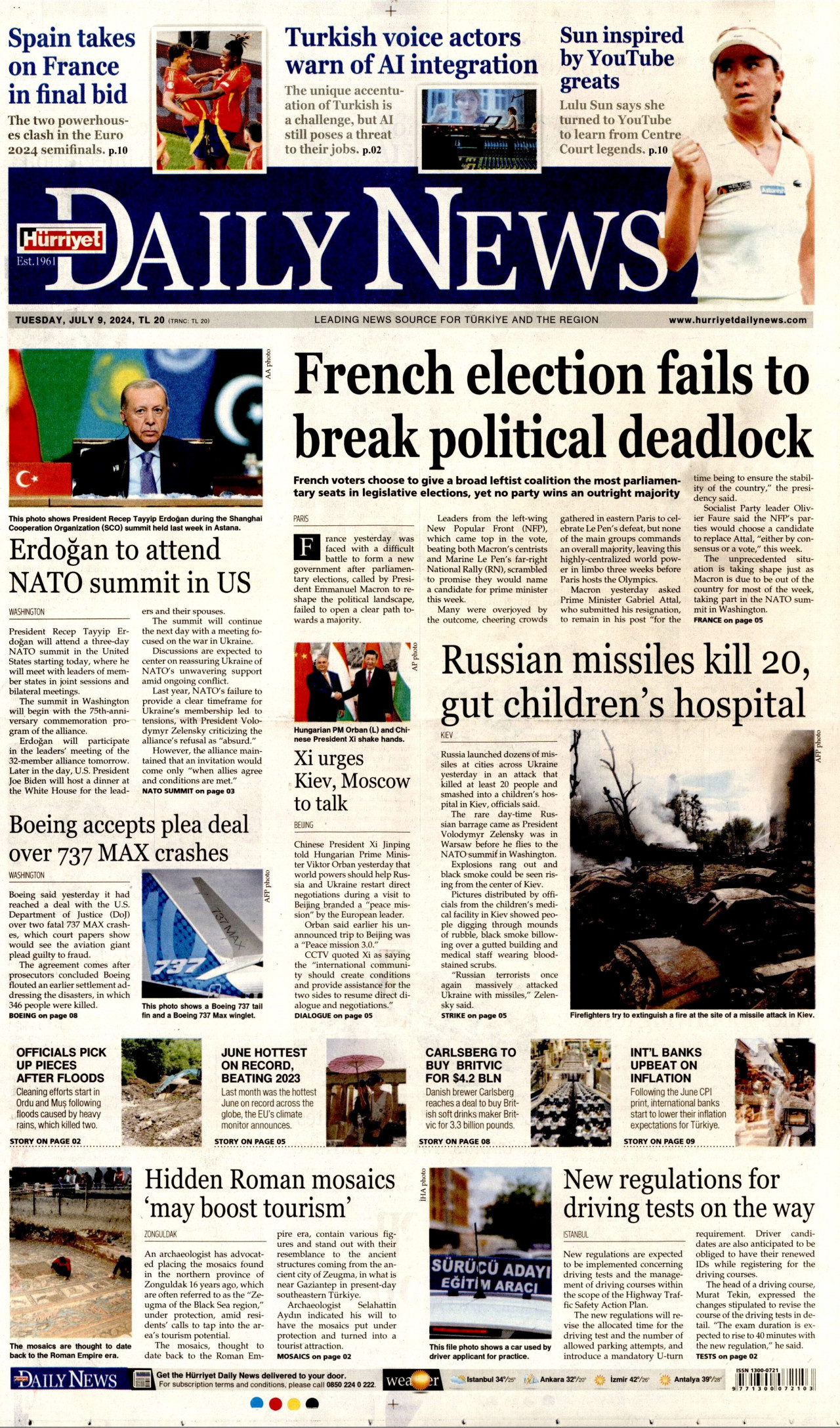 HÜRRİYET DAİLY NEWS Gazetesi 09 Temmuz 2024, Salı Günü Manşeti