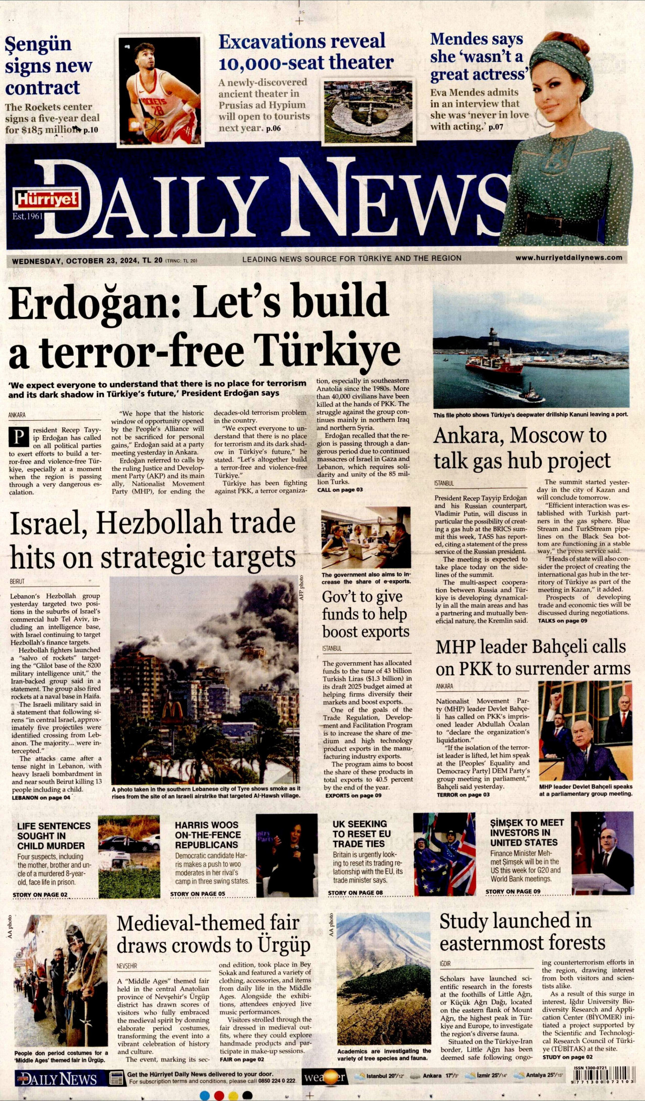 HÜRRİYET DAİLY NEWS Gazetesi 23 Ekim 2024, Çarşamba Günü Manşeti
