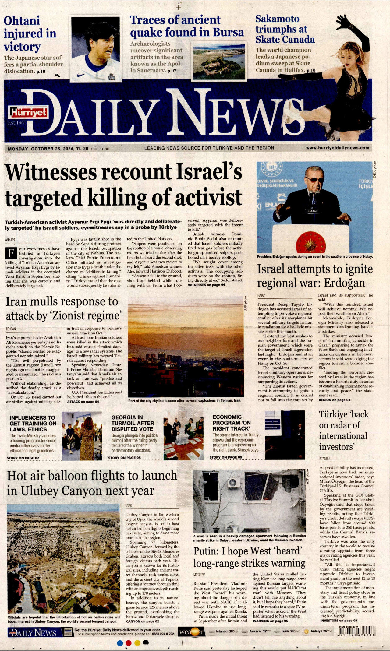 HÜRRİYET DAİLY NEWS Gazetesi 28 Ekim 2024, Pazartesi Günü Manşeti